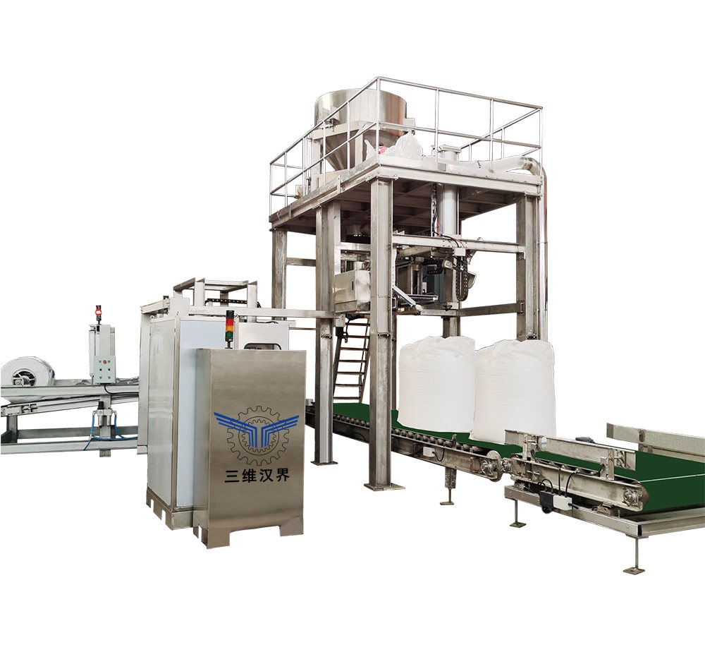 全自动吨袋包装机,也叫全自动大袋包装机、全自动吨袋包装秤、全自动大袋包装秤,是一种全自动吨袋包装设备,全自动吨袋包装机克服了吨袋包装机(吨袋包装秤、大袋包装机、大袋包装秤)需要人工上袋(挂袋)的缺点,实现了吨袋的自动上袋、物料自动称量、自动灌袋、自动输送、自动热合封口、自动喷码打印相关生产信息;全自动吨袋包装机可以应用在需要大袋包装的任何生产线,可以完美替代半自动人工上袋吨袋包装机,颗粒物料和粉体物料皆可以使用全自动吨袋包装机实现物料的自动包装盒输送。随着人工费用的增加,全自动吨袋包装机的使用推广范围越来越大。