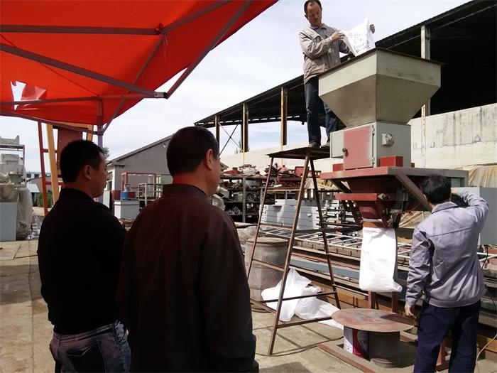图为定量包装秤DCS-Z-W正在测试包装五水偏硅酸钠,测试过程为:1.设置包装规格;2.人工将物料倒入过渡料仓内;3.人工将包装袋套在下料口;4.设备接收到套好包装袋后开始卸料;5.重量接近目标值时慢慢关闭卸料阀门;6.重量达到目标值时不再充填物料,完成包装。实际生产包装过程中,物料通过对应的设施直接进入包装秤上方的料仓内,自动到缓冲过渡料仓,然后按照设置好程序的连续称量包装,包装袋落到输送机上人工辅助进入缝包环节或选用配套自动折边缝包机。