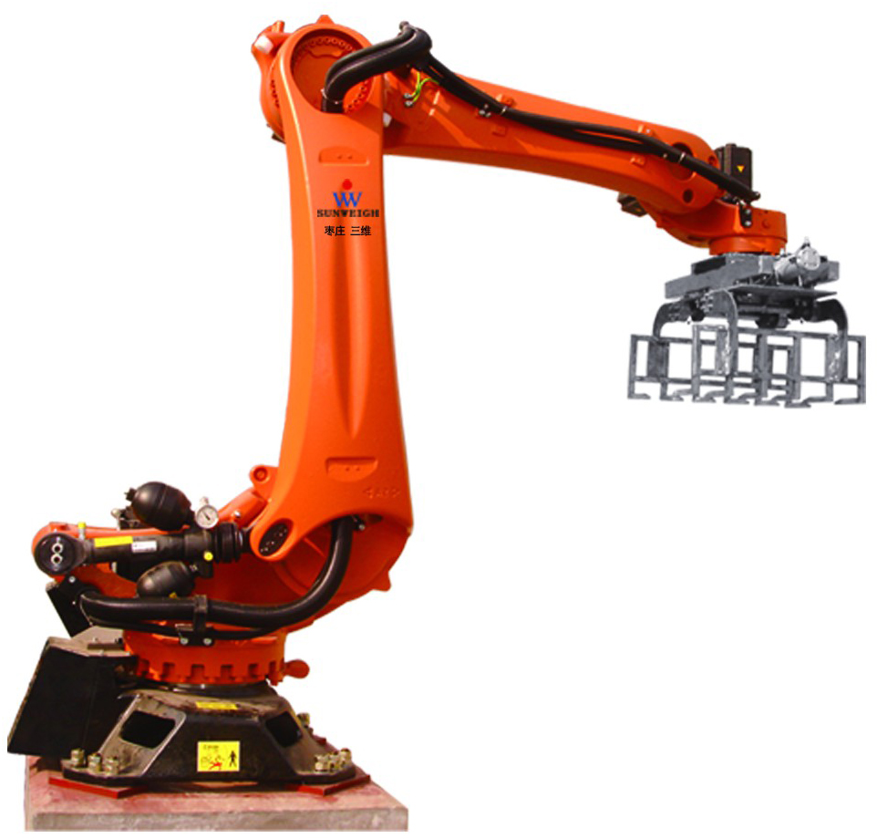 机械手码垛机别名码垛机械手,因其像一只手抓起然后放在指定位置,又称码垛机器人。由压平整理、缓冲输送机、抓取辊道、托盘机、机械手等装置组成,可对各种包装袋、包装箱进行码垛,具有堆垛速度快、自动化水平高的特点。